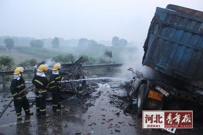 据藁城高速交警大队介绍,当时燃烧最猛烈的是载有烟花炮竹的小货车,另一辆大挂车尾部也起火。小货车上的两名男子,一人当场死亡,另外一人重伤被送往医院抢救。