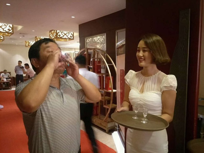 第二个环节,进入会场前要饮一杯财神酒。喝了这杯财神酒,今年财神跟着走。本次财神酒的饮用在形式上对饮酒提出了要求,按着“杯满为礼,不溢为敬”的标准,遵循“先文后武,先礼后兵”的君子之道,故而“轻举杯,重掷杯”。一饮而尽,一滴不留!尽显酣畅痛快!”。经销商朋友们虽然喝了很多年的酒,却还是第一次这样喝酒,都感觉在品味玉蝉老酒的同时,更在品读中国饮酒的文化。这也把玉蝉老酒的历史文化和饮酒文化深深的融合在一起。