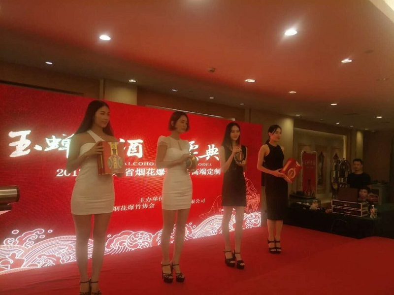 在徐超总监讲解定制酒的结尾时刻,安排了四位漂亮的美女模特进行走秀表演并做产品形象展示,让经销商朋友能更近距离的接触玉蝉老酒定制产品。