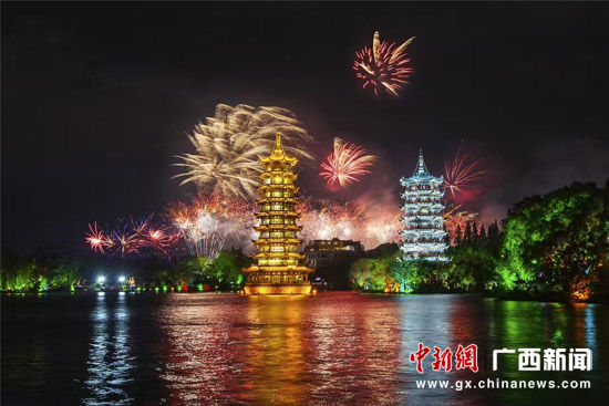 中新网桂林8月28日电(赵琳露)8月27日晚,广西首届国际音乐焰火节在桂林象山公园举行,璀璨焰火在200米高空相继绽放,点亮桂林山水,吸引了全城数万市民游客观看。