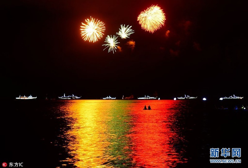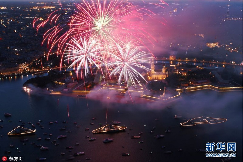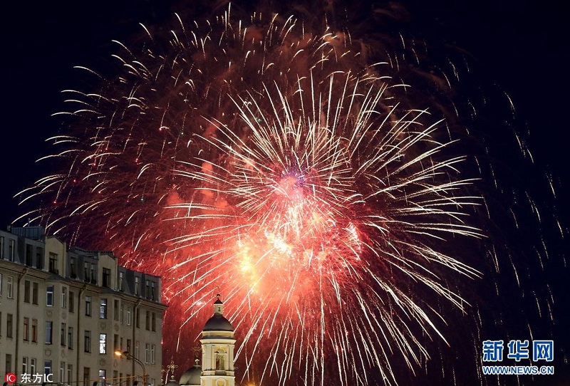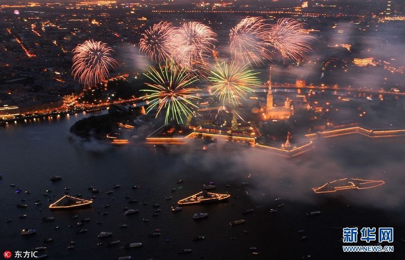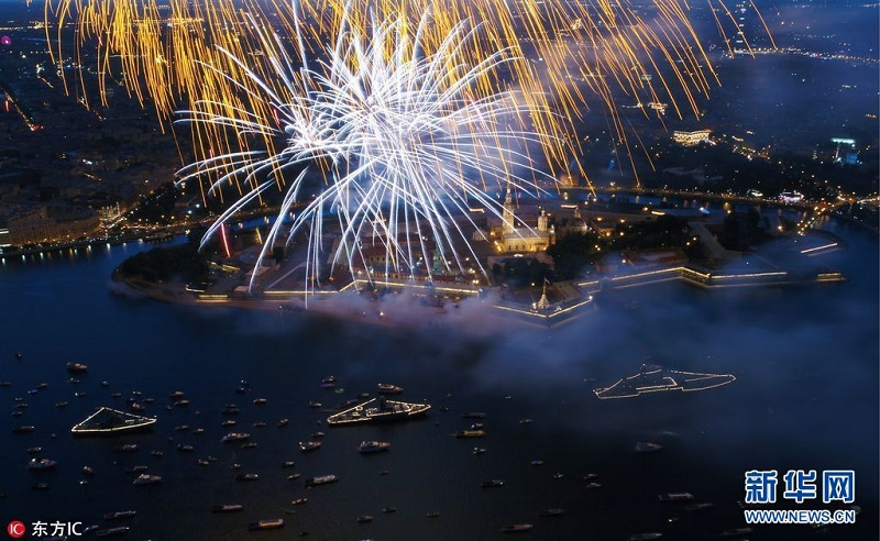 当地时间2017年7月30日,俄罗斯圣彼得堡,俄罗斯燃放烟花,庆祝海军日。(图片来源: 东方IC)