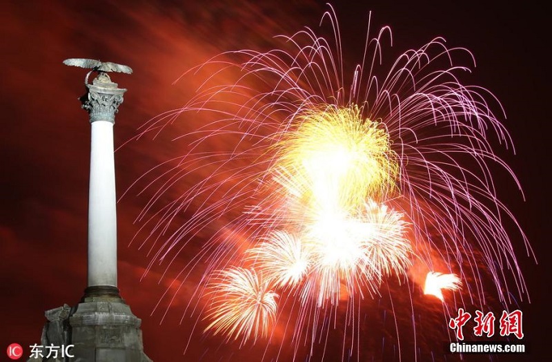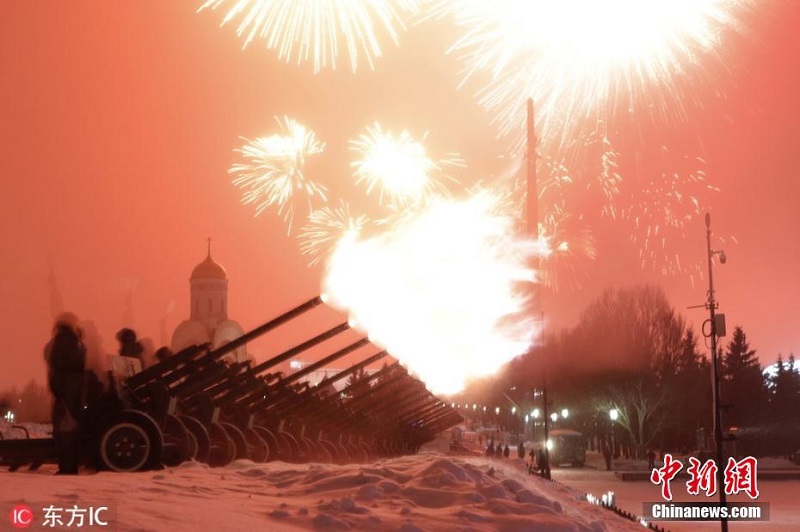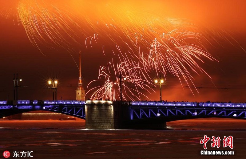 俄罗斯庆祝祖国保卫者日 绚烂焰火绽放夜空