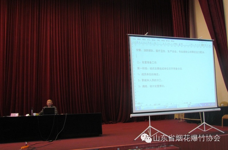 为配合山东省烟花爆竹生产企业退出生产领域,4月7日借召开全省烟花爆竹交易会之际,500多名与会人员接受了国家烟花爆竹标准化委员会核心专家委员、国家安全生产醴陵烟花爆竹检测检验中心常务副主任肖湘杰,对新标准及烟花爆竹余废料、半成品处置安全技术措施等技术问题的详细讲解,为生产企业退出提供了技术保障;同时也为批发经营企业销毁过期及罚没产品提供了技术帮助。