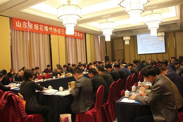 2017年3月26日,山东省烟花爆竹协会在泰安召开三届六次理事会,会长白宗印、副会长张长虎、韩萍萍、杨霞、刘宝、赵斌、李建林、杨彦军及各理事单位代表参加会议,秘书长邹卫红主持会议。