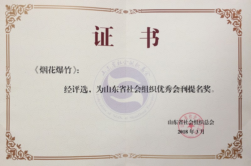 会刊《烟花爆竹》获山东省社会组织优秀会刊提名奖称号