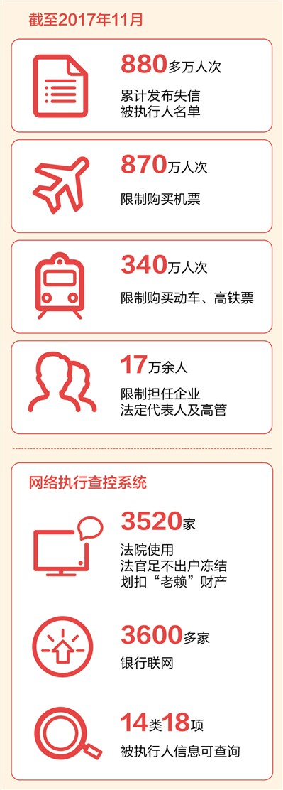 最高法开通了网络执行查控系统,目前已与中国人民银行、公安部、交通部、工商总局、银监会、证监会等部门对接,可以在全国22万个银行营业网点对被执行人的财产进行查控。2016年,最高法会同国家发改委等44家单位联合签署了《关于对失信被执行人实施联合惩戒的合作备忘录》。同年,中办、国办联合印发《关于加快推进失信被执行人信用监督、警示和惩戒机制建设的意见》,规定了11类37项惩戒措施,使“老赖”寸步难行、无处遁形。